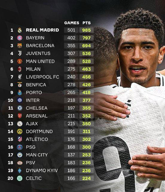 皇马共进行了501场比赛,积分达到985分。这里的积分计算方式是按照胜利获3分,平局获1分,并且加时和点球不计入其中。实际上,当皇马进行498场比赛时,他们已经拿下985分。不过我们也知道,本赛季皇马的最后三场欧冠比赛全部落败,先是输给马德里竞技,随后被阿森纳横扫。
